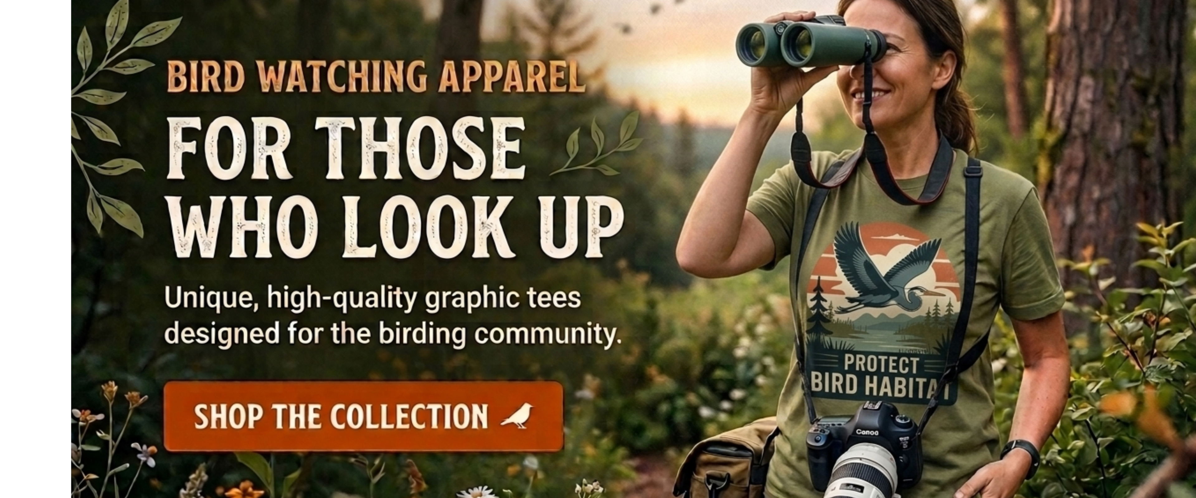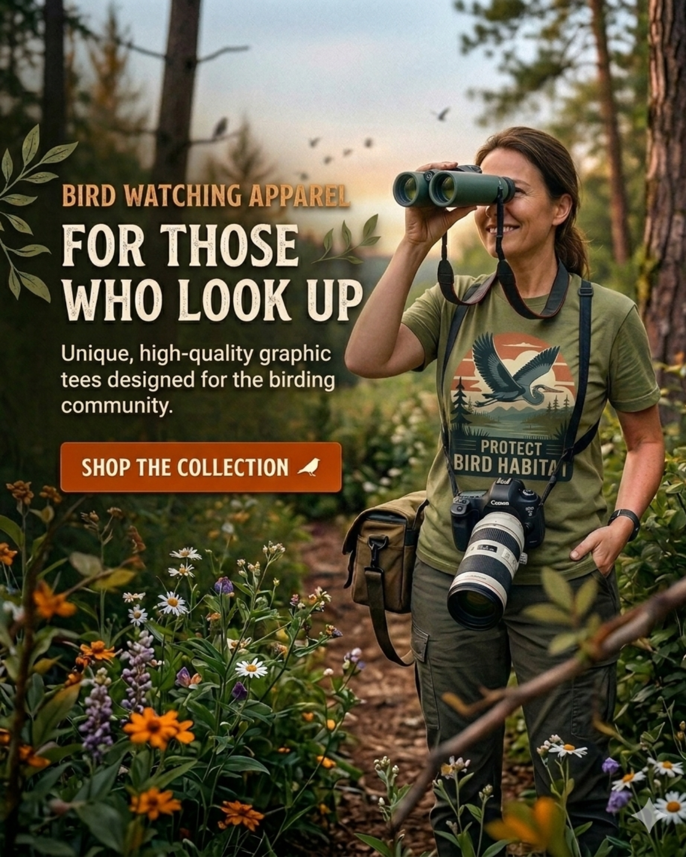 Our tees are made from 100% ring-spun cotton — soft and lightweight for a lazy morning of backyard birding, durable enough to follow you wherever the birds take you.